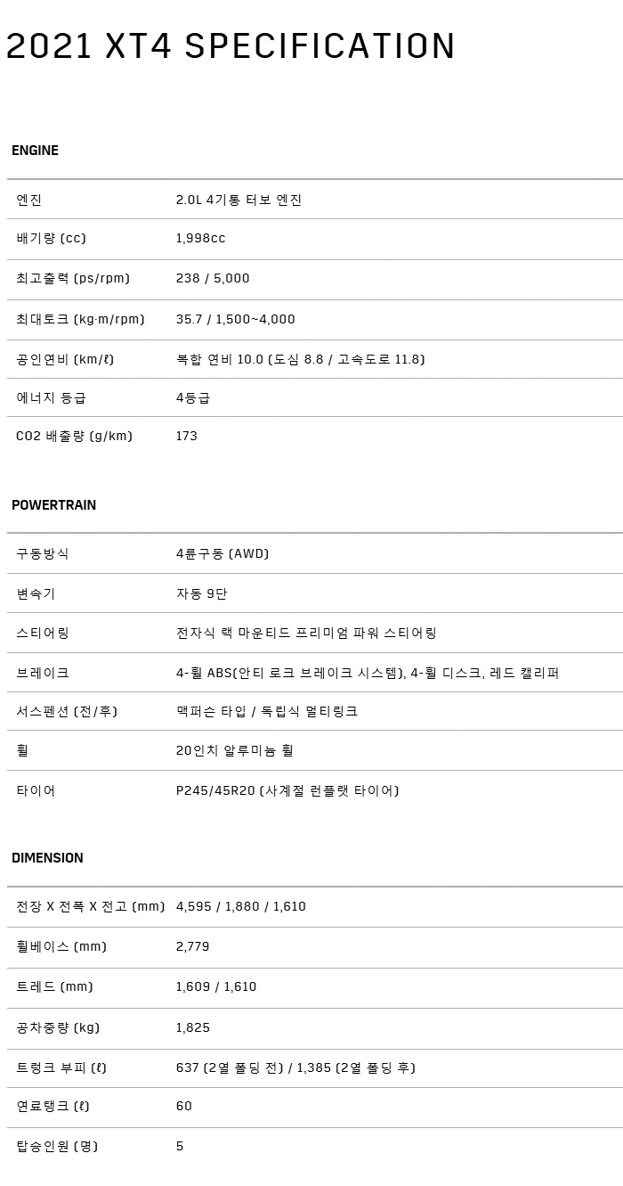 캐딜락 xt4 제원 / 캐딜락 xt4 연비