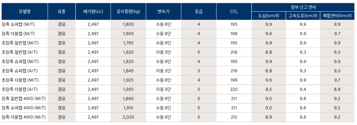 포터2 연비는 모델과 변속기에 따라 조금씩 차이가 있으며 복합연비 기준 8.9km/l~9.9km/l 사이의 연료효율이 나옵니다.