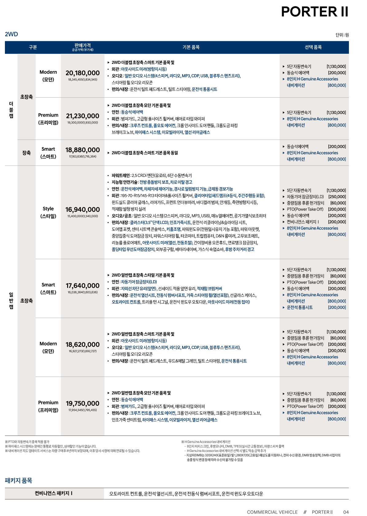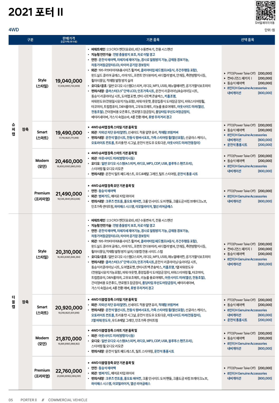 2021 포터 4륜 가격은 슈퍼캡 장축 스타일 트림이 19,040,000원, 스마트 트림이 19,490,000원, 모던 트림이 20,460,000원, 프리미엄 트림이 21,490,000원 입니다.