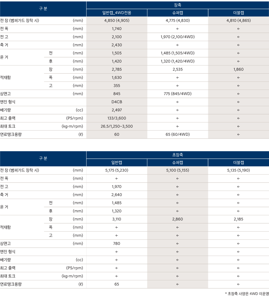 포터2 제원은 초장축 슈퍼캡 범퍼가드 장착 기준으로 전장 5155mm, 전폭 1740mm, 전고 1970mm, 축거(휠베이스) 2640mm 입니다.