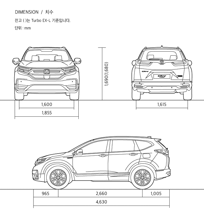 혼다 cr-v 제원은 전장 4630mm, 전폭 1855mm, 전고 1690mm 휠베이스 2660mm 입니다. (하이브리드 기준 / cr-v 터보 전고는 1680mm)