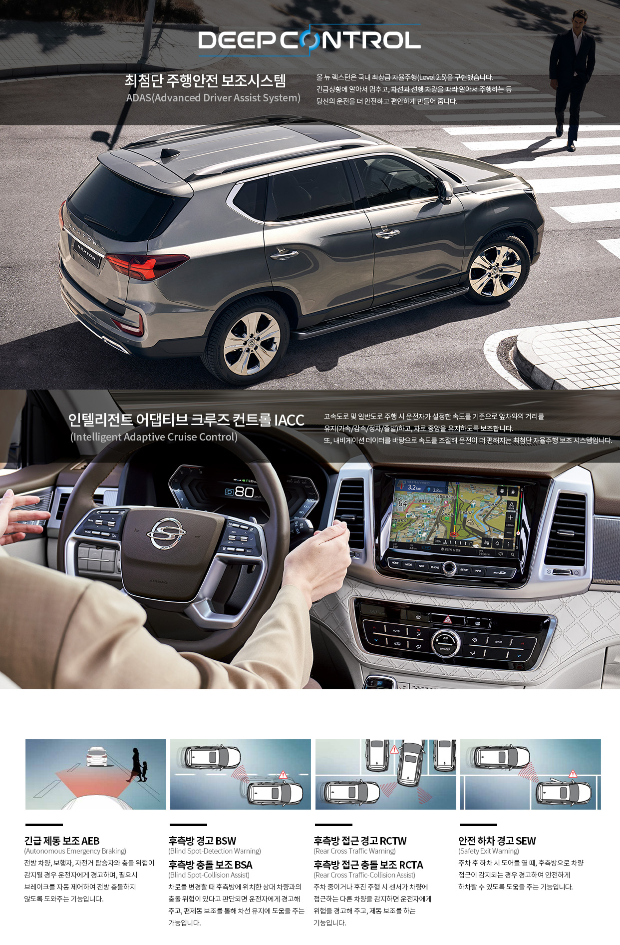 올 뉴 렉스턴이 이전에 비해 달라진 부분 중 하나는 주행보조(ADAS) 사양을 강화한 점이라 할 수 있는데요. 긴급제동보조, 차선 유지보조, 앞차 출발 알림, 부주의 운전경보, 안전거리 경보, 스마트하이빔 등을 모든 트림에 기본으로 적용했습니다.