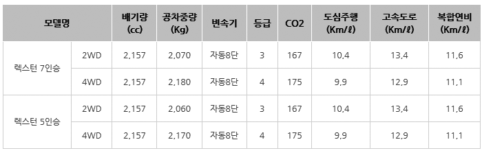 올 뉴 렉스턴 제원 / 올 뉴 렉스턴 연비