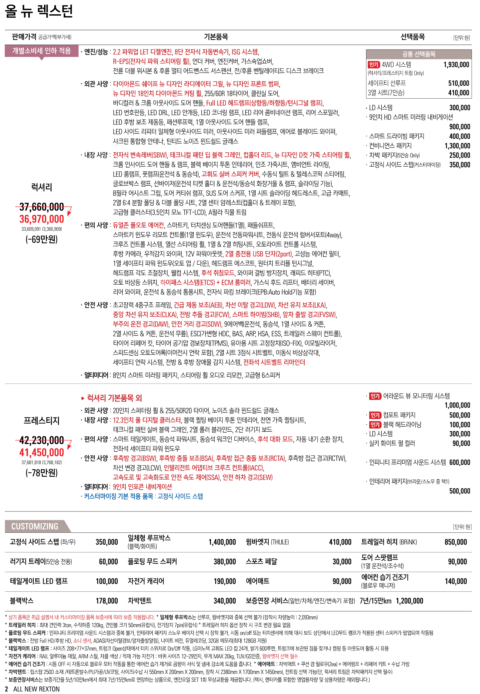 올 뉴 렉스턴 가격은 럭셔리 트림이 36,970,000원, 프레스티지 티림이 41,450,000원이며, 스페셜 트림인 올 뉴 렉스턴 더 블랙 가격은 49,150,000원입니다.