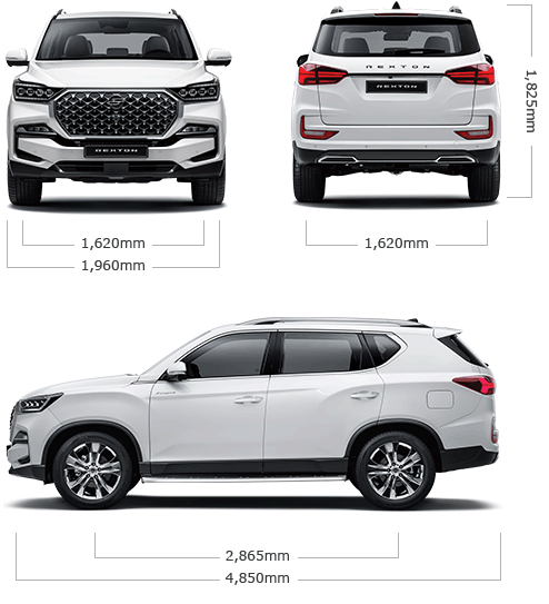 올 뉴 렉스턴 제원은 전장 4850mm, 전폭 1960mm, 전고 1825mm, 휠베이스(축거) 2865mm 입니다.