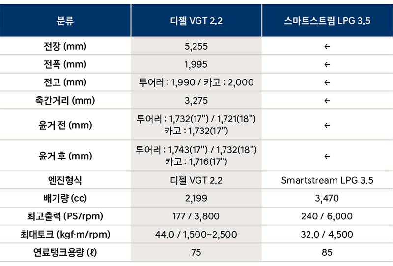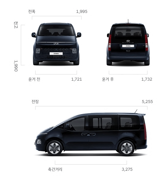 스타리아 제원은 전장 5255mm, 전폭 1995mm, 전고 1990mm(투어러)/2000mm(카고), 휠베이스(축거) 3275mm입니다.