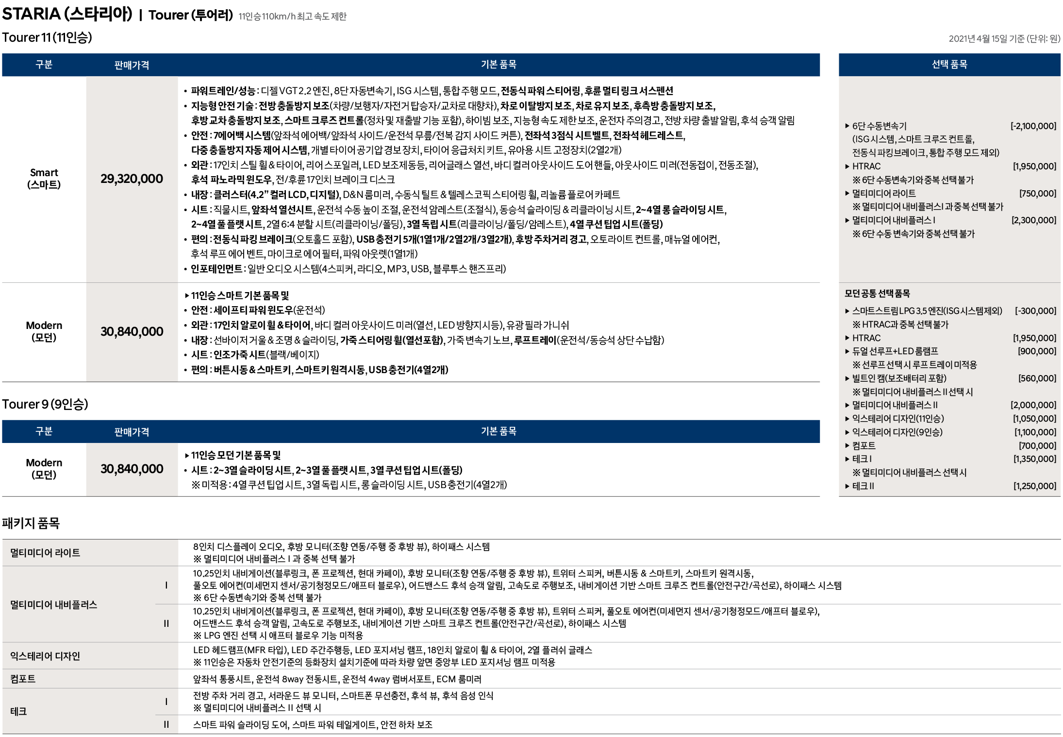만약 자동변속기가 아닌 스타리아 수동변속기를 적용할 경우에는 기본 가격에서 210만원이 빠지며, 스타리아 11인승과 9인승 LPG 모델 가격은 모던 트림 기본 가격에서 30만원이 빠진 가격입니다.