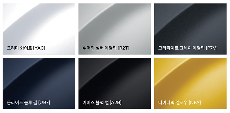 스타리아 색상은 크리미 화이트 [YAC], 쉬머링 실버 메탈릭 [R2T], 그라파이트 그레이 메탈릭 [P7V], 문라이트 블루 펄 [UB7], 어비스 블랙 펄 [A2B], 다이나믹 옐로우 [NFA] 등 6가지 외장 컬러가 있으며 실내 색상은 블랙과 베이지 2가지가 있습니다.