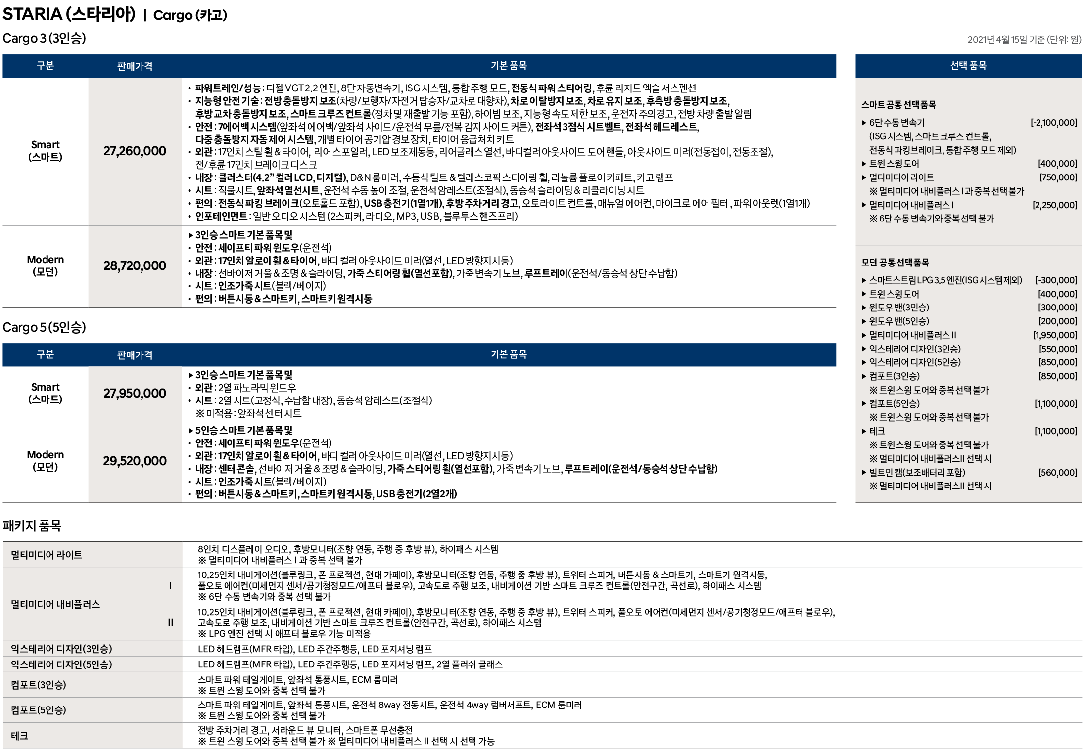 스타리아 카고 수동변속기 적용시에는 위 기본 가격에서 210만원이 빠지며, 스타리아 lpg 카고 가격은 모던 트림 기본 가격에서 30만원이 빠진 가격이 기본 가격입니다.