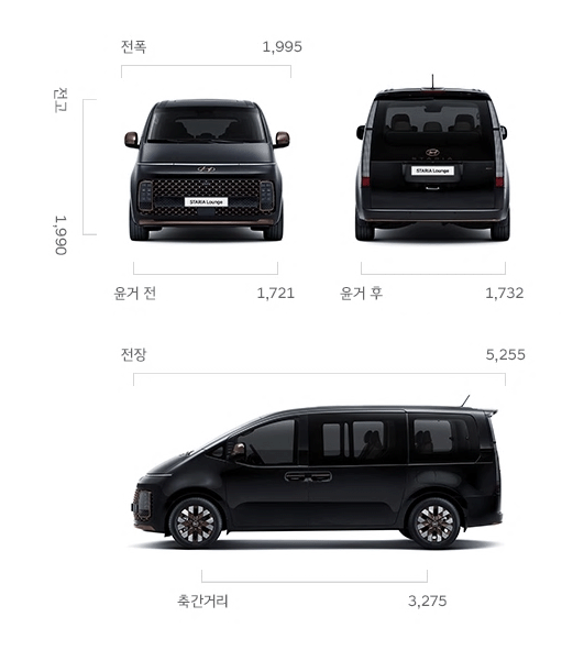 스타리아 라운지 제원은 전장 5255mm, 전폭 1995mm, 전고 1990mm, 휠베이스(축거) 3275mm인데요. 그랜드 스타렉스와 비교했을 때 전장은 105mm, 전폭은 75mm, 전고는 20mm, 휠베이스는 75mm 더 여유로운 사이즈를 가졌습니다.