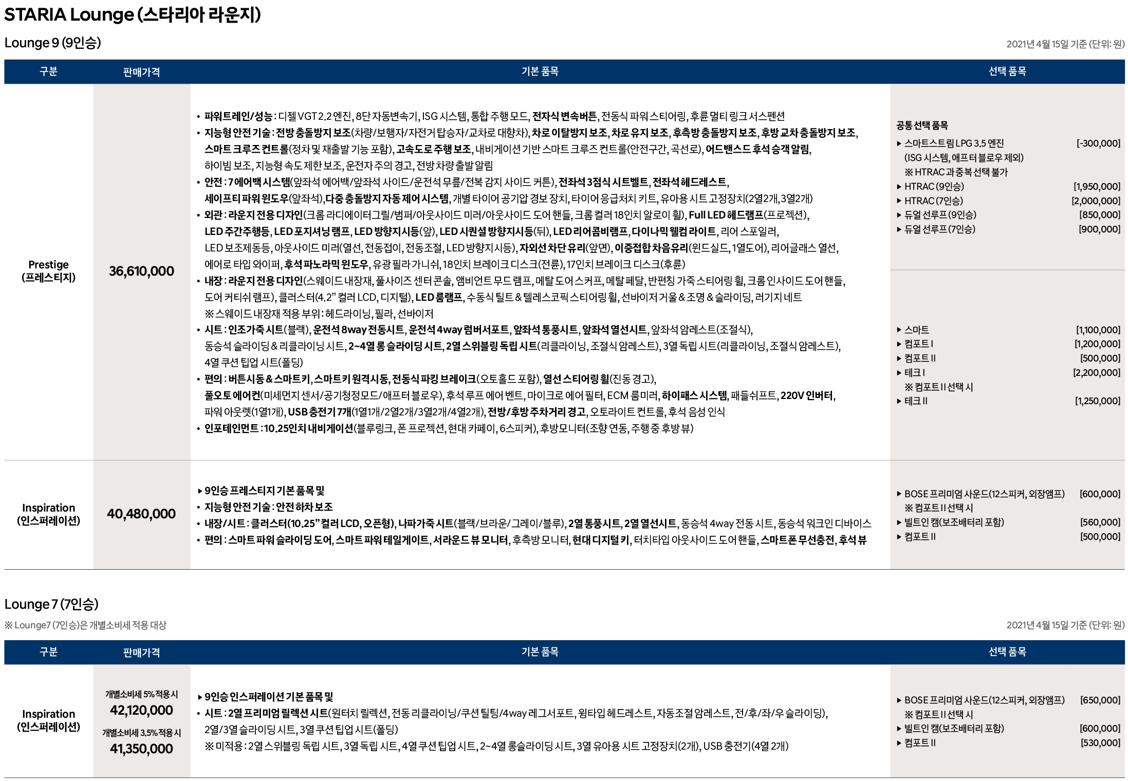 2열 프리미엄 릴렉션 시트를 기본으로 탑재한 스타리아 라운지는 7인승 가격은 개별소비세 3.5% 기준 41,350,000원이며, 2열 스위블링 시트를 기본으로 탑재한 스타리아 라운지 9인승 가격은 36,610,000원입니다.