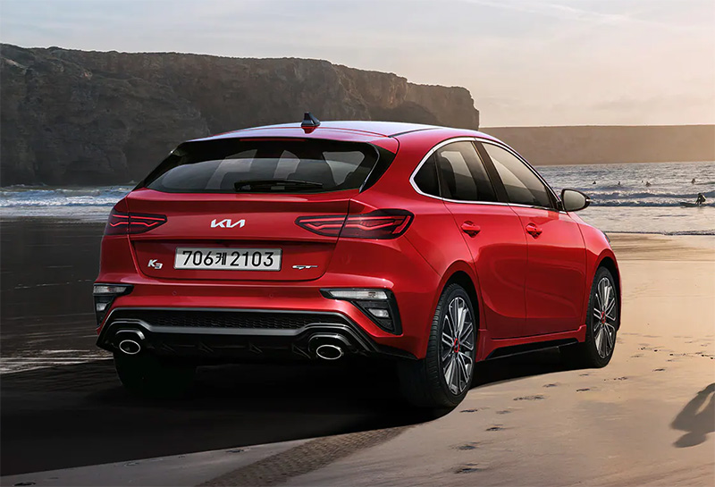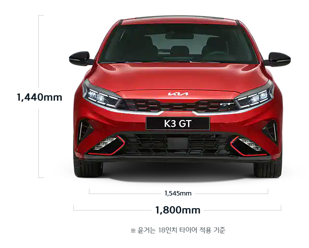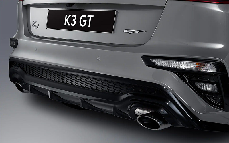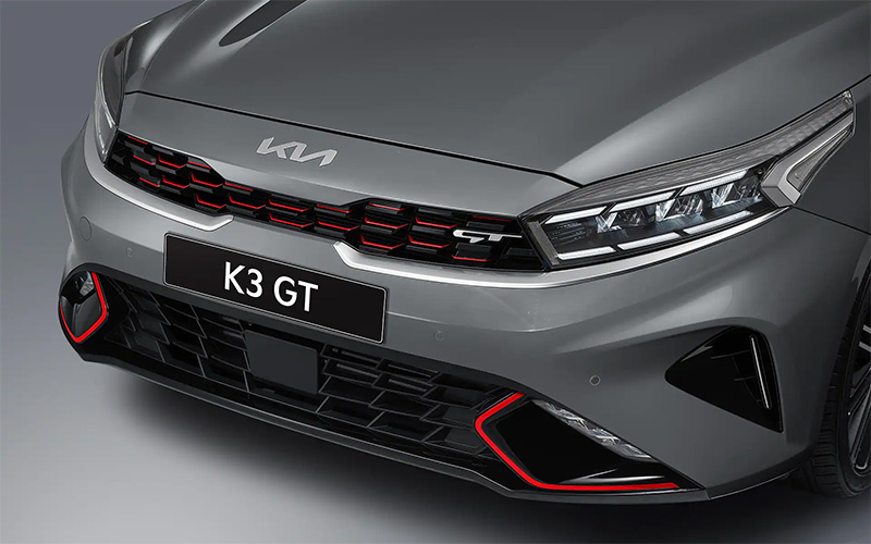 K3 GT 모델은 레드컬러 포인트를 넣은 전면 라디에이터 그릴과 새로운 범퍼 하단부를 통해 다이내믹함을 더했습니다.