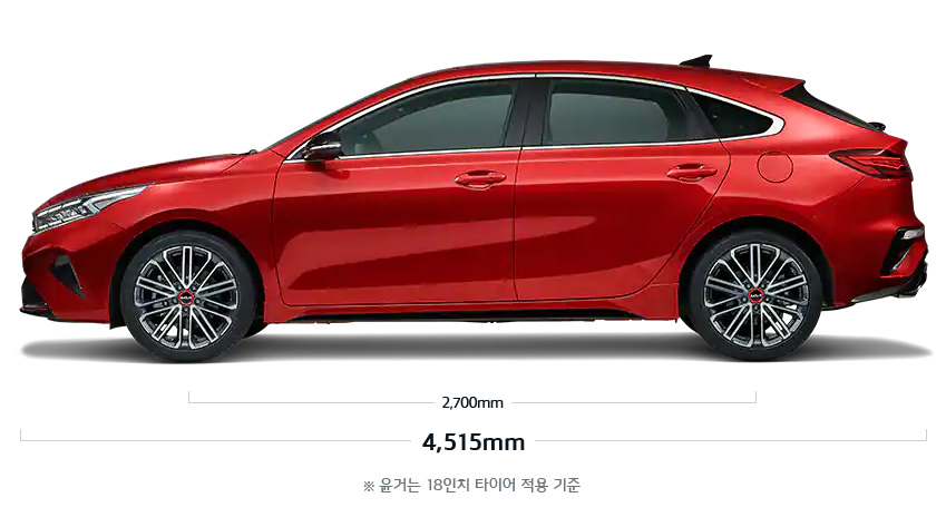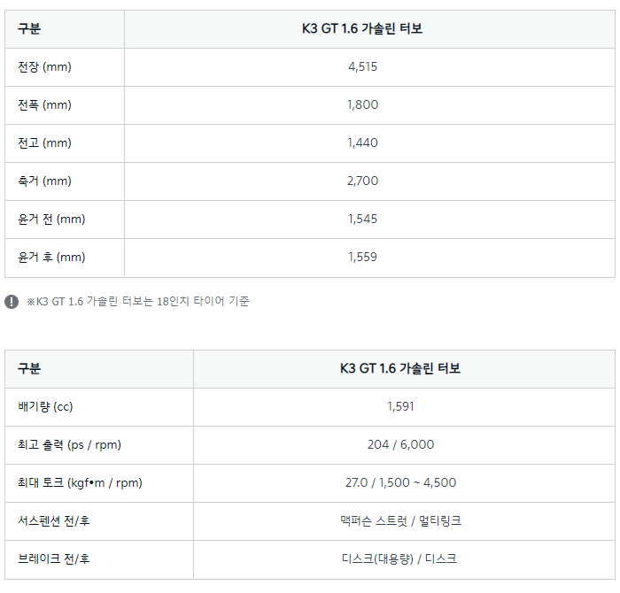 K3 GT 제원은 전장 4515mm, 전폭 1800mm, 전고 1440mm, 휠베이스(축거) 2700mm이며 최고출력 204마력, 최대토크 27.0kgf•m/1500~4500rpm의 성능을 발휘합니다.
