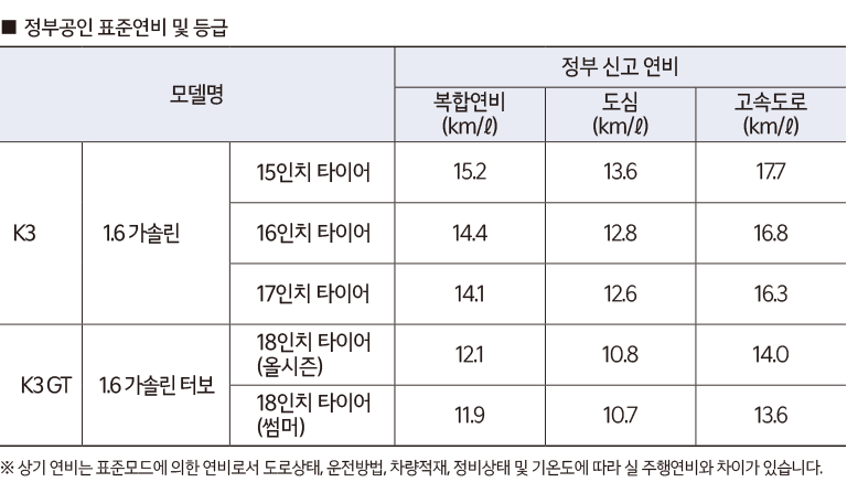 더뉴 k3 연비는 15인치 타이어 장착시 복합연비 15.2km/ℓ이며, k3 gt 연비는 18인치 올시즌 타이어 장착 기준 복합연비 12.1km/ℓ입니다.