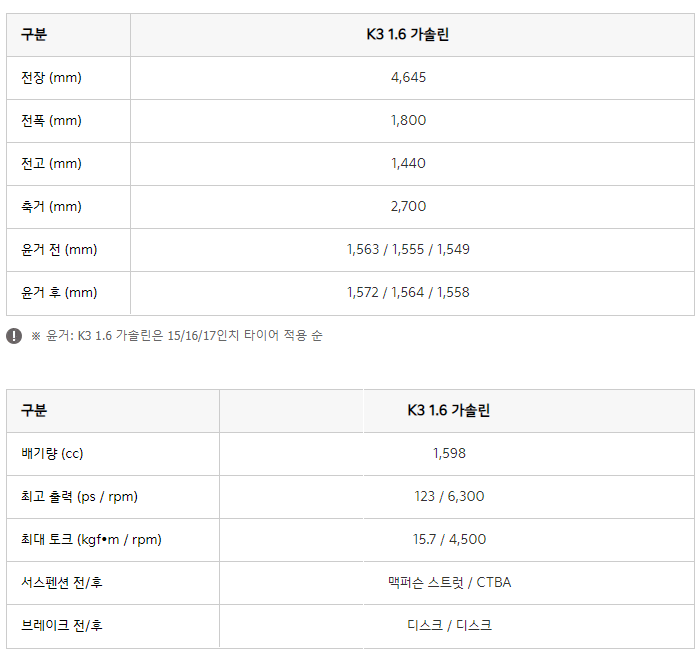 더 뉴 K3 제원은 전장 4645mm, 전폭 1800mm, 전고 1440mm, 휠베이스(축거) 2700mm이며 최고출력 123마력, 최대토크 15.7kgf•m/4500rpm의 성능을 발휘합니다.