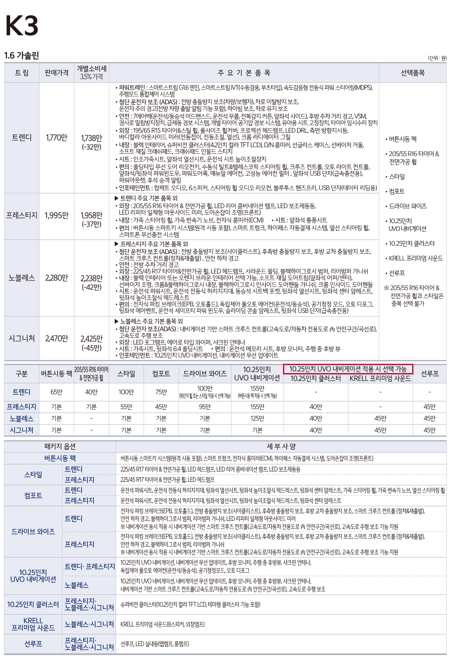 더 뉴 k3 1.6가솔린 4도어 모델 가격은 트렌디 트림이 17,380,000원, 프레스티지 19,580,000원, 노블레스 22,380,000원, 시그니처 24,250,000원입니다.