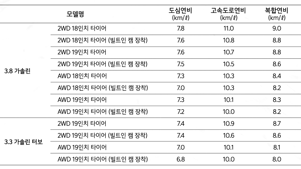 k9 연비는 3.3 가솔린 터보 모델이 복합연비 기준 8~8.7km/l이며, 3.8 가솔린 모델은 복합연비 기준 8.2~9km/l 입니다.