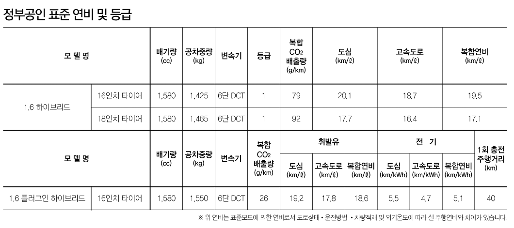 니로 연비는 1.6 하이브리드 모델에 16인치 타이어 적용시 복합연비 19.5 km/ℓ이며, 플러그인 하이브리드 연비는 휘발유 주행시 복합연비 18.6 km/ℓ이고 전기 1회 충전시 40km 주행이 가능합니다.