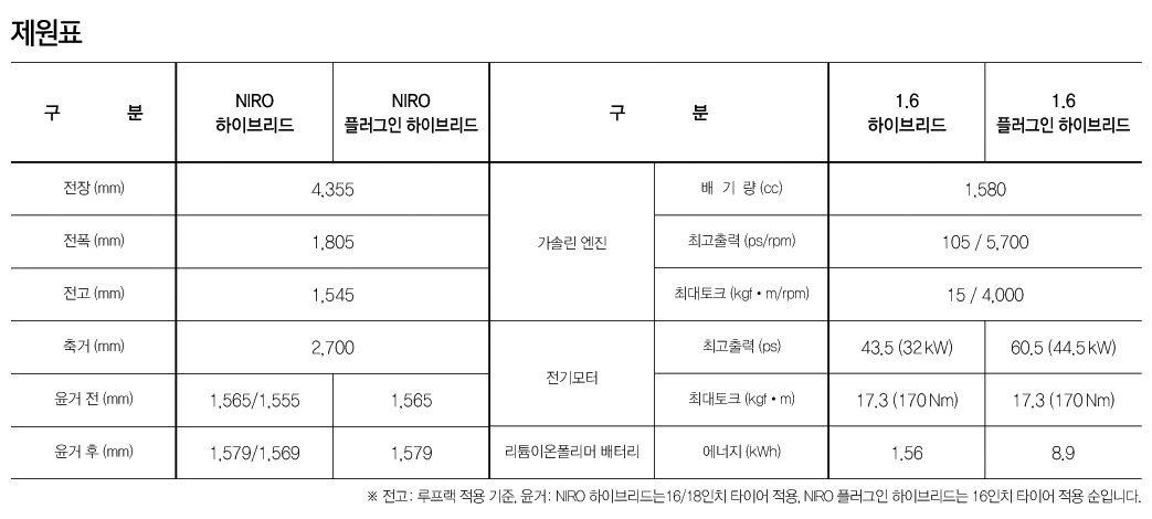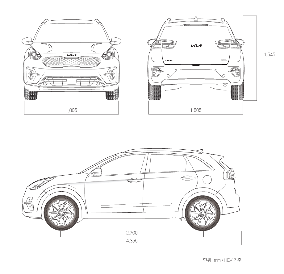 니로 제원은 전장 4355mm, 전폭 1805mm, 전고 1545mm, 축거(휠베이스) 2700mm입니다.
