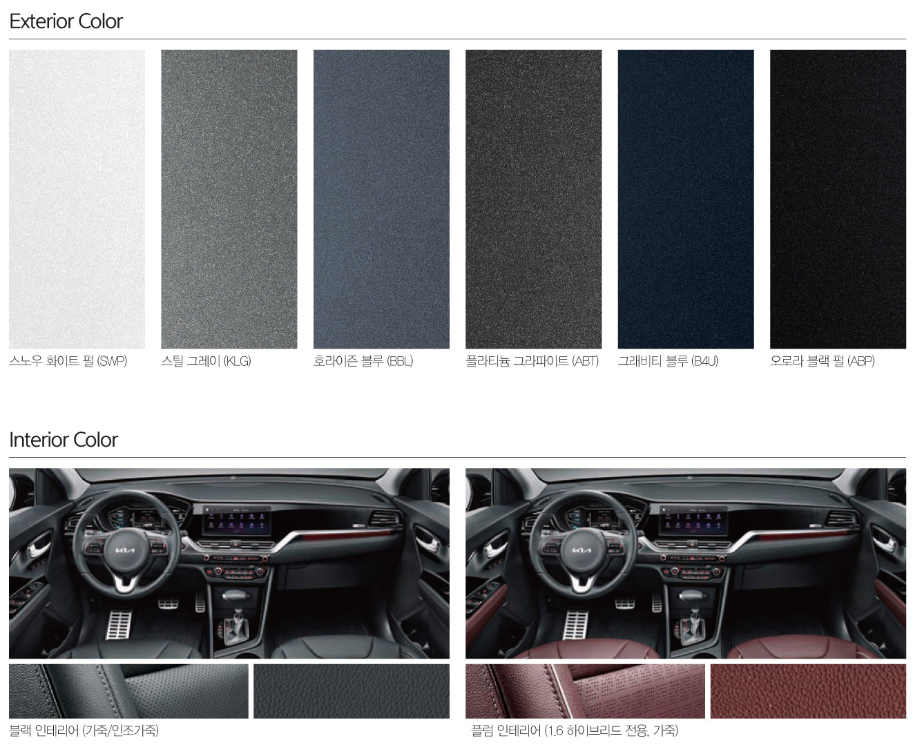 니로 외장 색상은 스노우 화이트 펄(SWP), 스틸 그레이(KLG), 호라이즌 블루(BBL), 플라티늄 그라파이트(ABT), 그래비티 블루(B4U), 오로라 블랙 펄(ABP) 등 6가지 외장 컬러가 있습니다.