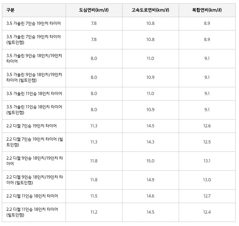 2022 카니발 제원 및 연비
