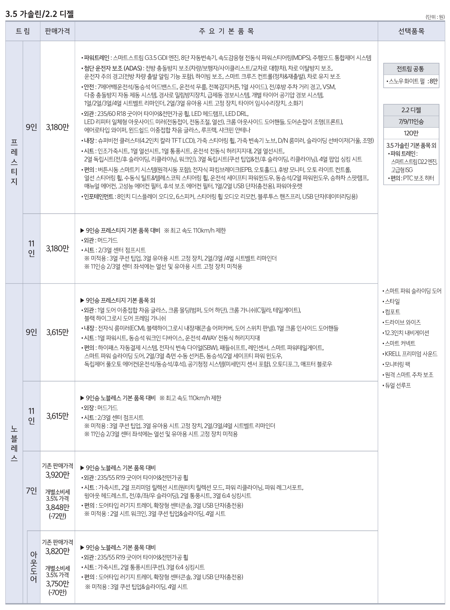 카니발 9인승과 11인승은 개별소비세 비과세 대상 차량이라 향후 개별소비세가 인상되더라도 영향이 없는 차량입니다.