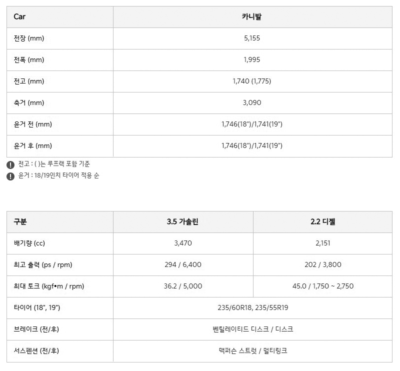 2022 카니발 제원은 전장 5155mm, 전폭 1995mm, 전고 1740mm, 축거(휠베이스) 3090mm이며 카니발 3.5 가솔린 모델은 최고출력 294마력과 최대토크 36.2 / 5,000 (kgf·m/rpm)을 카니발 2.2 디젤 모델은 최고출력 202마력과 최대토크 45.0 / 1,750 ~ 2,750 (kgf·m/rpm)의 성능을 발휘합니다.