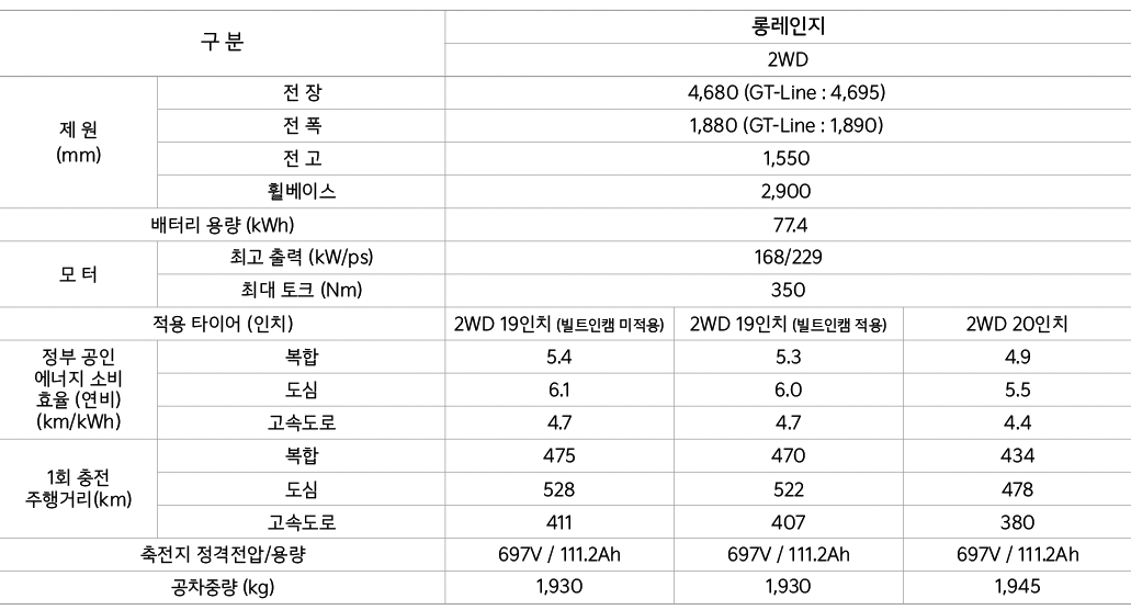 ev6 제원은 전장 4680mm, 전폭 1880mm, 전고 1550mm, 축간거리(축거) 2900mm인데요. 플랫폼을 공유하는 아이오닉5와 비교해 보면 전장은 45mm 길고 전고는 55mm 낮지만 축거는 아이오닉5가 100mm 더 깁니다.