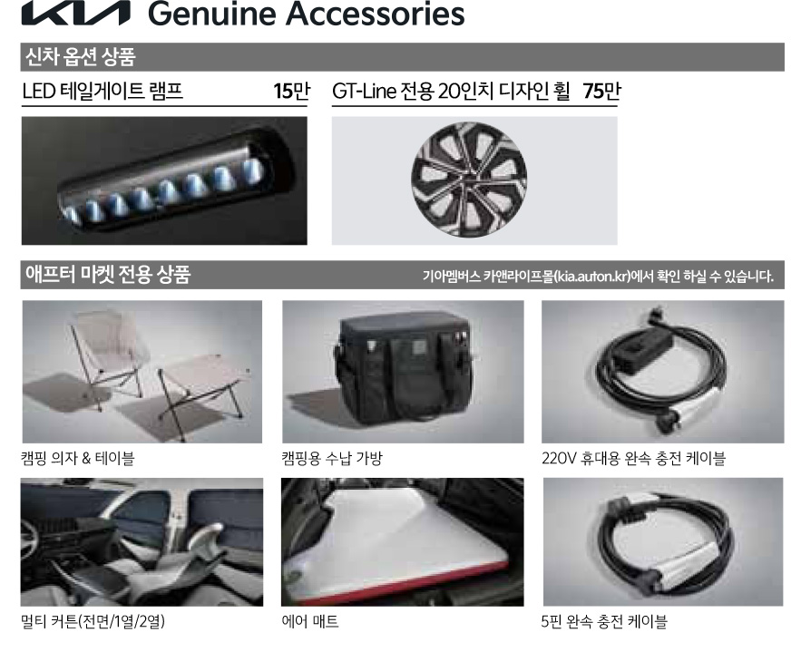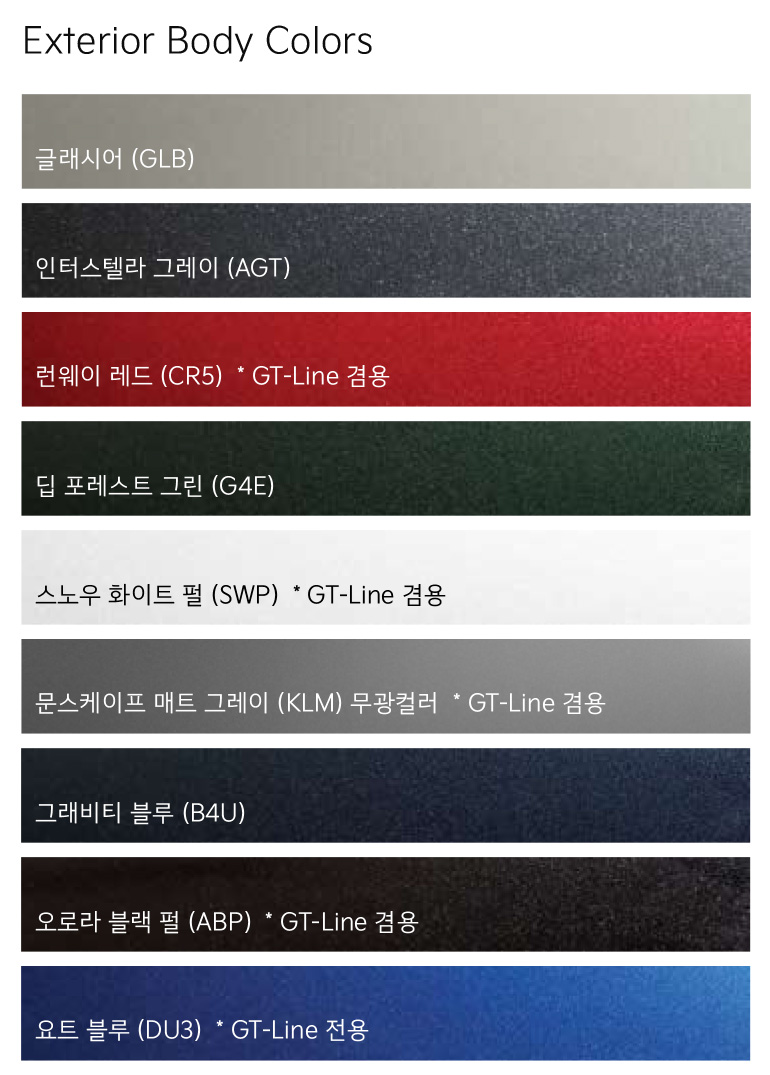 이 중에서 스노우 화이트 펄, 오로라 블랙 펄, 런웨이 레드, 문스케이프 매트 그레이 무광컬러는 GT-Line 겸용 컬러이며 요트 블루는 GT-Line 전용 컬러 입니다.