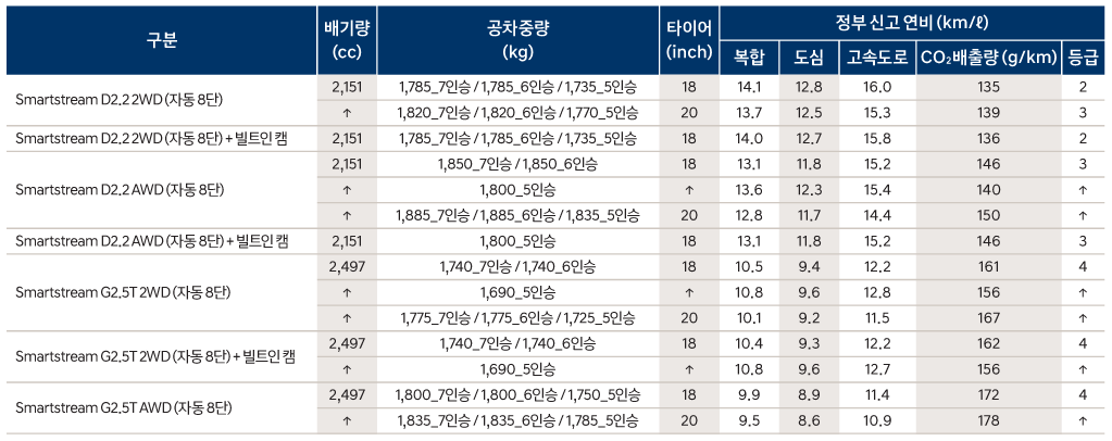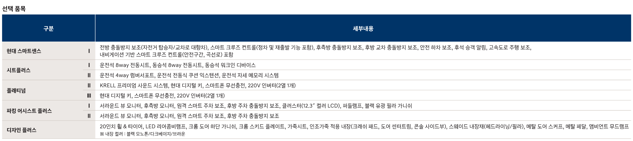최상위 캘리그래피 트림에는 현대 디지털키, 스마트폰 무선충전, 220V 인버터(2열 1개) 등의 사양을 기본으로 탑재해 편의성을 향상했습니다.