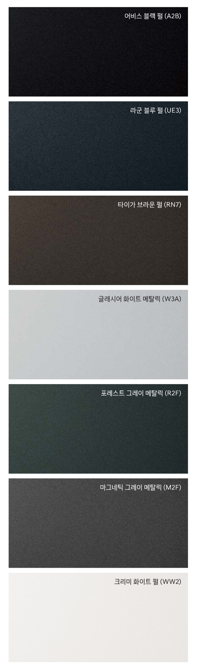 2022 싼타페 색상은 어비스 블랙 펄 (A2B), 라군 블루 펄 (UE3), 타이가 브라운 펄 (RN7), 글래시어 화이트 메탈릭 (W3A), 포레스트 그레이 메탈릭 (R2F), 마그네틱 그레이 메탈릭 (M2F), 크리미 화이트 펄 (WW2) 등 7가지 외장 컬러가 있습니다.