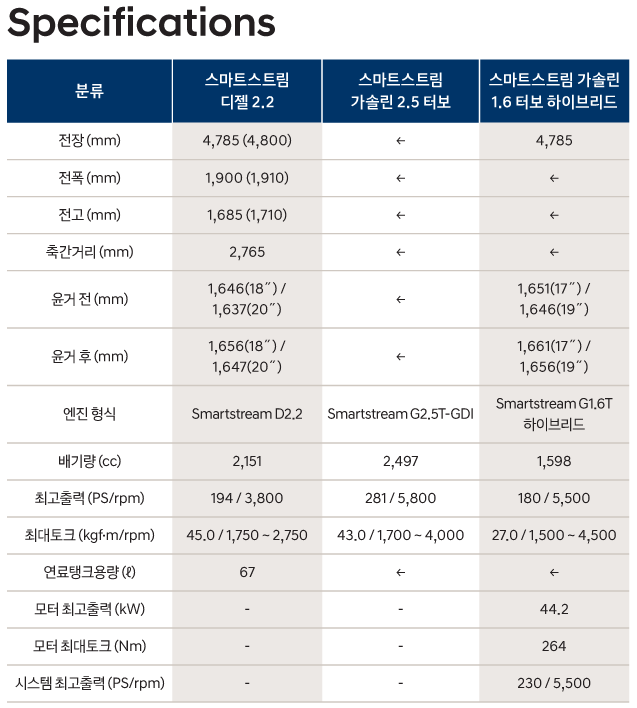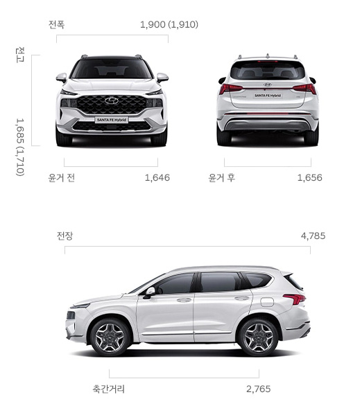 싼타페 하이브리드 제원은 전장 4785mm, 전폭 1900mm, 전고 1685mm, 축거(휠베이스) 2765mm이며, 스마트스트림 G1.6T 하이브리드 엔진을 탑재해 최고출력 180마력, 최대토크 27.0 kgf.m, 모터 최고출력 44.2kW, 모터 최대토크 264Nm, 시스템 최고출력 230마력/5,500 rpm의 성능을 발휘합니다.