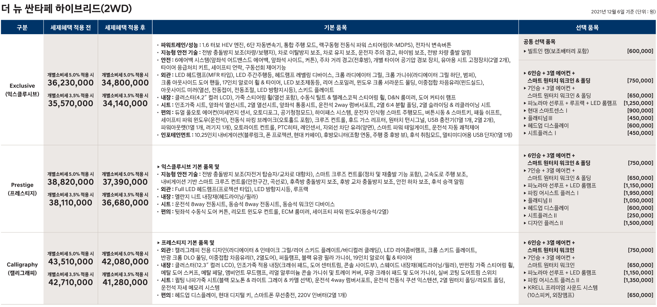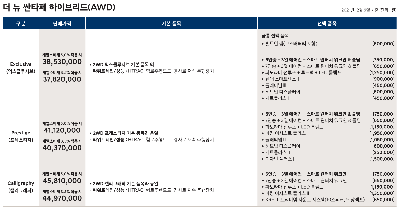 싼타페 하이브리드 가격은 개별소비세 3.5% 기준으로 2륜 익스클루시브 트림이 34,140,000원, 프레스티지 트림이 36,680,000원, 캘리그래피 트림이 41,280,000원입니다.