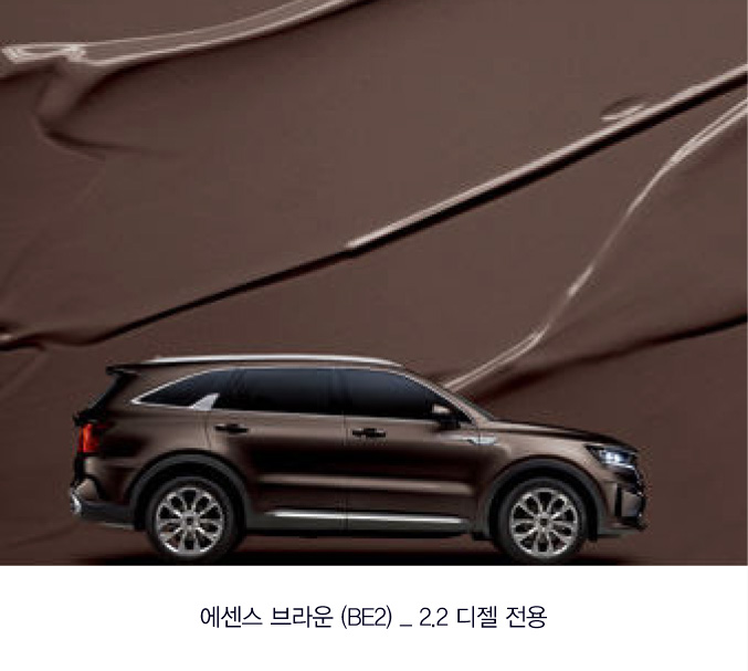 쏘렌토 색상 중 에센스 브라운 (BE2) 컬러는 디젤 모델 전용 컬러로 하이브리드 모델에는 적용되지 않습니다.