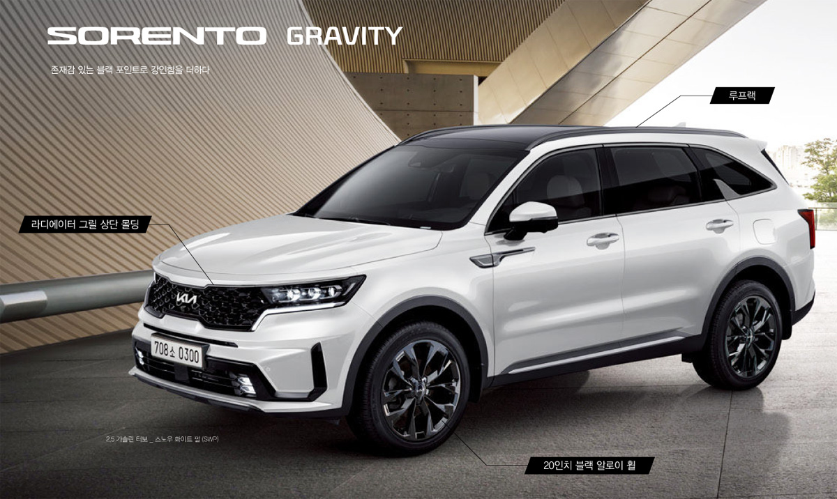 최상위 시그니처 트림에 차별화된 디자인을 입힌 쏘렌토 그래비티 트림에는 프로젝션 LED 헤드램프와 프론트 LED 턴시그널 램프, 235/55 R19 컨티넨탈 타이어&전면가공 휠, 그래비티 전용 가죽시트 등이 포함되며, 라디에이터 그릴 상단 몰딩과 루프랙, 서라운드 몰딩, 1열 도어 사이드 가니쉬 부위에 그래비티 전용 디자인이 적용됩니다.