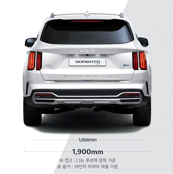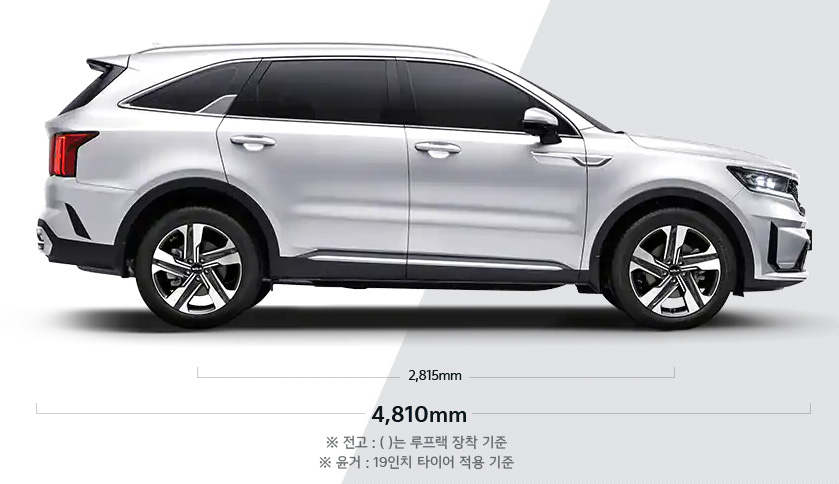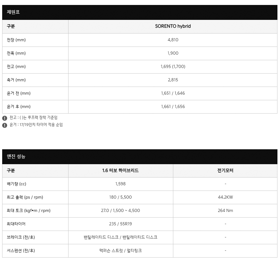 쏘렌토 하이브리드 제원은 전장 4810mm, 전폭 1900mm, 전고 1695(루프랙 장착 시 1700mm), 축거 2815mm이며, 1.6리터 가솔린 터보 엔진과 전기모터의 효율성을 더해 시스템 출력 230마력과 시스템 토크 35.7kgf.m의 성능을 발휘합니다.
