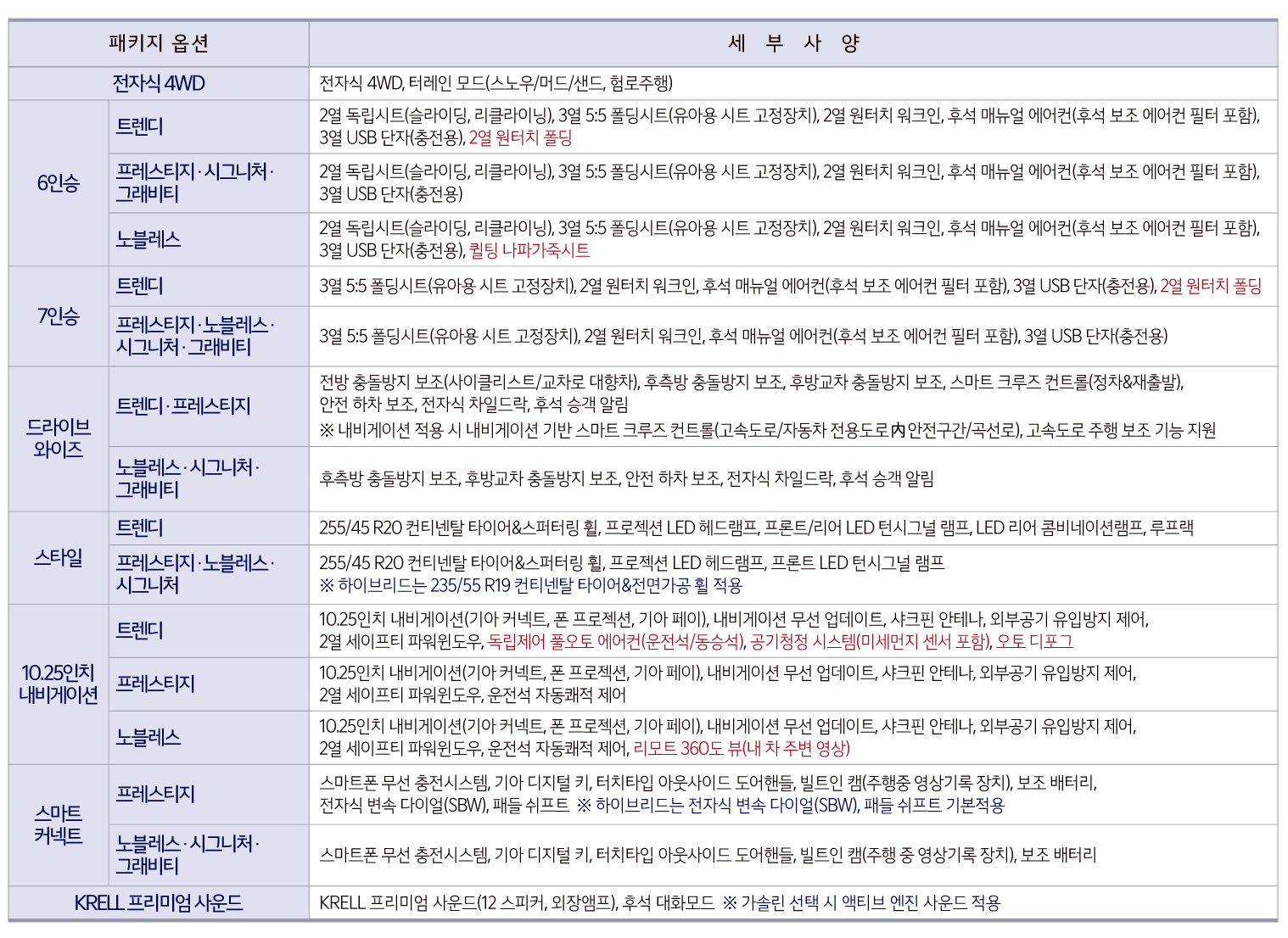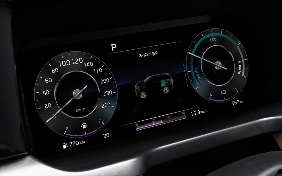 쏘렌토 하이브리드 노블레스 트림부터는 전방 충돌방지 보조(사이클리스트/교차로 대향차), 스마트 크루즈 컨트롤(정차&재출발) 등의 첨단 운전자 보조 시스템을 지원하며, 12.3인치 풀사이즈 칼라 TFT LCD를 장착한 슈퍼비전 클러스터, 가죽시트, 서라운드 뷰 모니터, 후측방 모니터, 운전자세 메모리 시스템 등이 기본으로 포함됩니다.