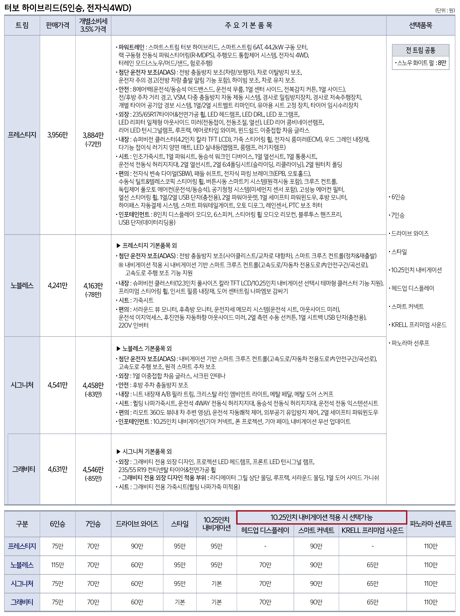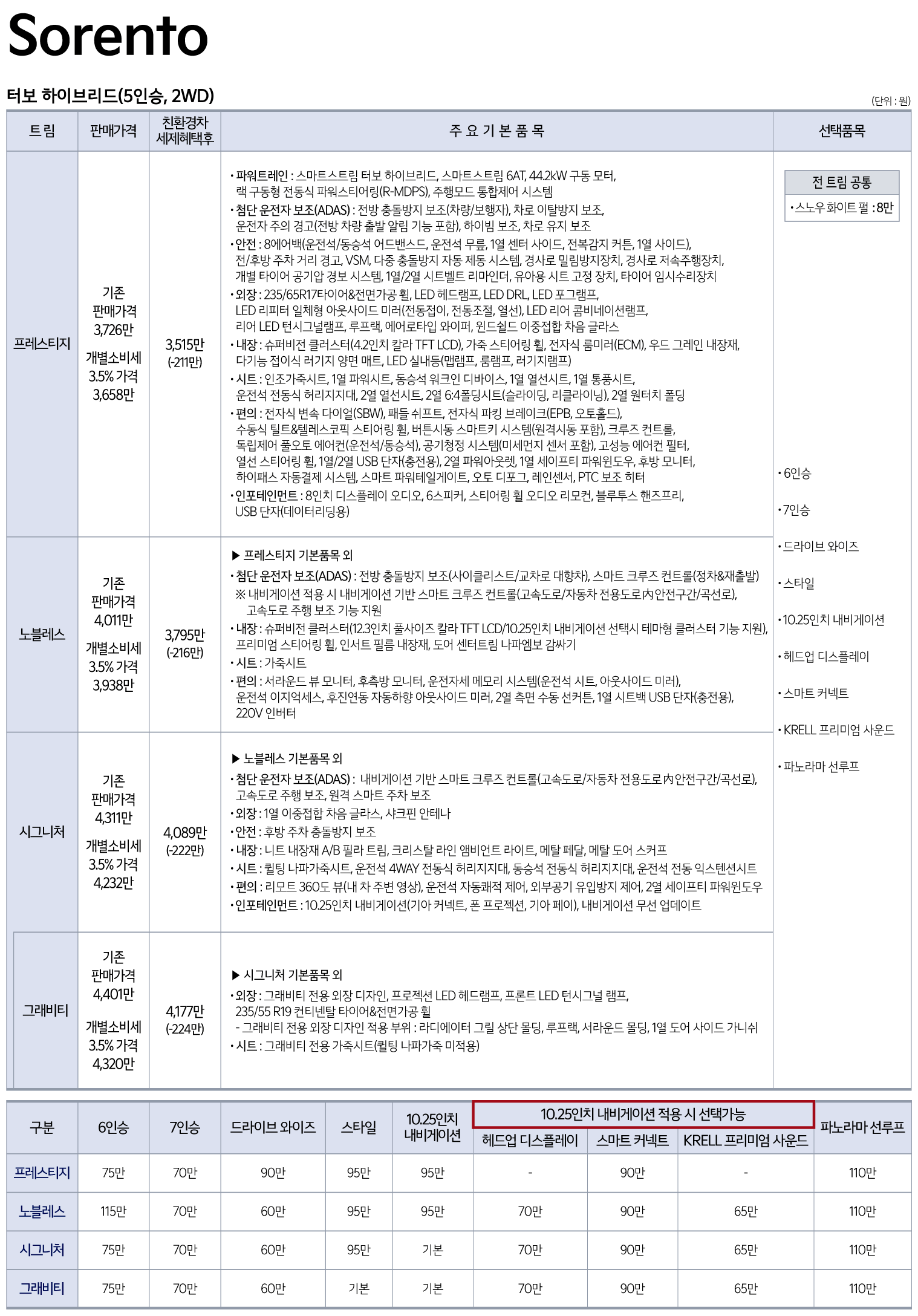 쏘렌토 하이브리드 가격은 2륜구동 모델 프레스티지 트림이 35,150,000원, 노블레스 트림이 37,950,000원, 시그니처 트림이 40,890,000원, 그래비티 트림이 41,770,000원입니다. (친환경 혜택 적용 기준)