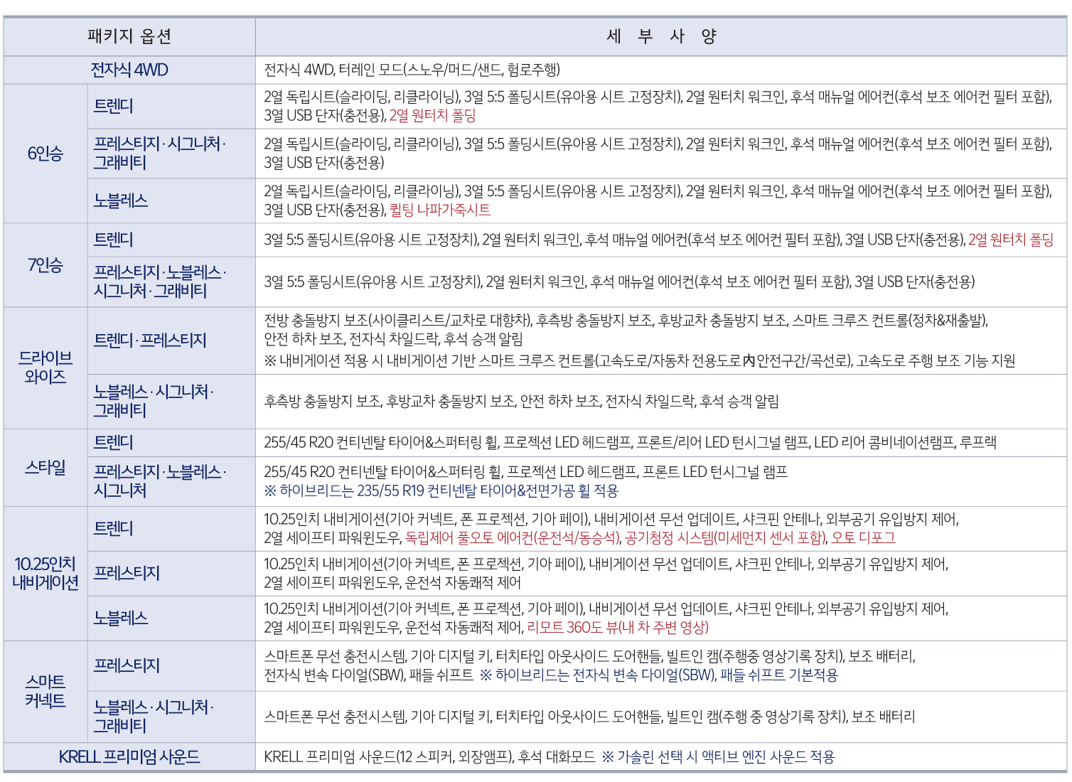 이전 모델에서 옵션으로 선택해야 했던 LED 실내등을 모든 트림에 기본으로 포함시켰으며, 프레스티지 트림에는 LED 리어 콤비네이션 램프와 리어 LED 턴 시그널 램프, 루프랙, 1열 파워시트, 동승석 워크인 디바이스, 2열 열선시트, 1열 통풍시트, 2열 원터치 폴딩, 전자식 룸미러(ECM), 하이패스 자동결제 시스템, 오토 디포그, 레인센서, 독립제어 풀오토 에어컨(운전석/동승석 ), 공기청정 시스템(미세먼지 센서 포함), 스마트 파워 테일게이트 등이 포함되었습니다.