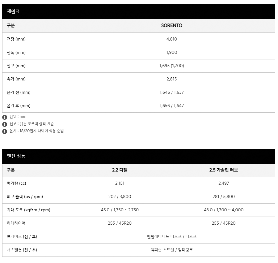 2022 쏘렌토 제원은 전장 4810mm, 전폭 1900mm 전고 1695mm(루프랙 장착 시 1700mm), 축거 2815mm입니다.