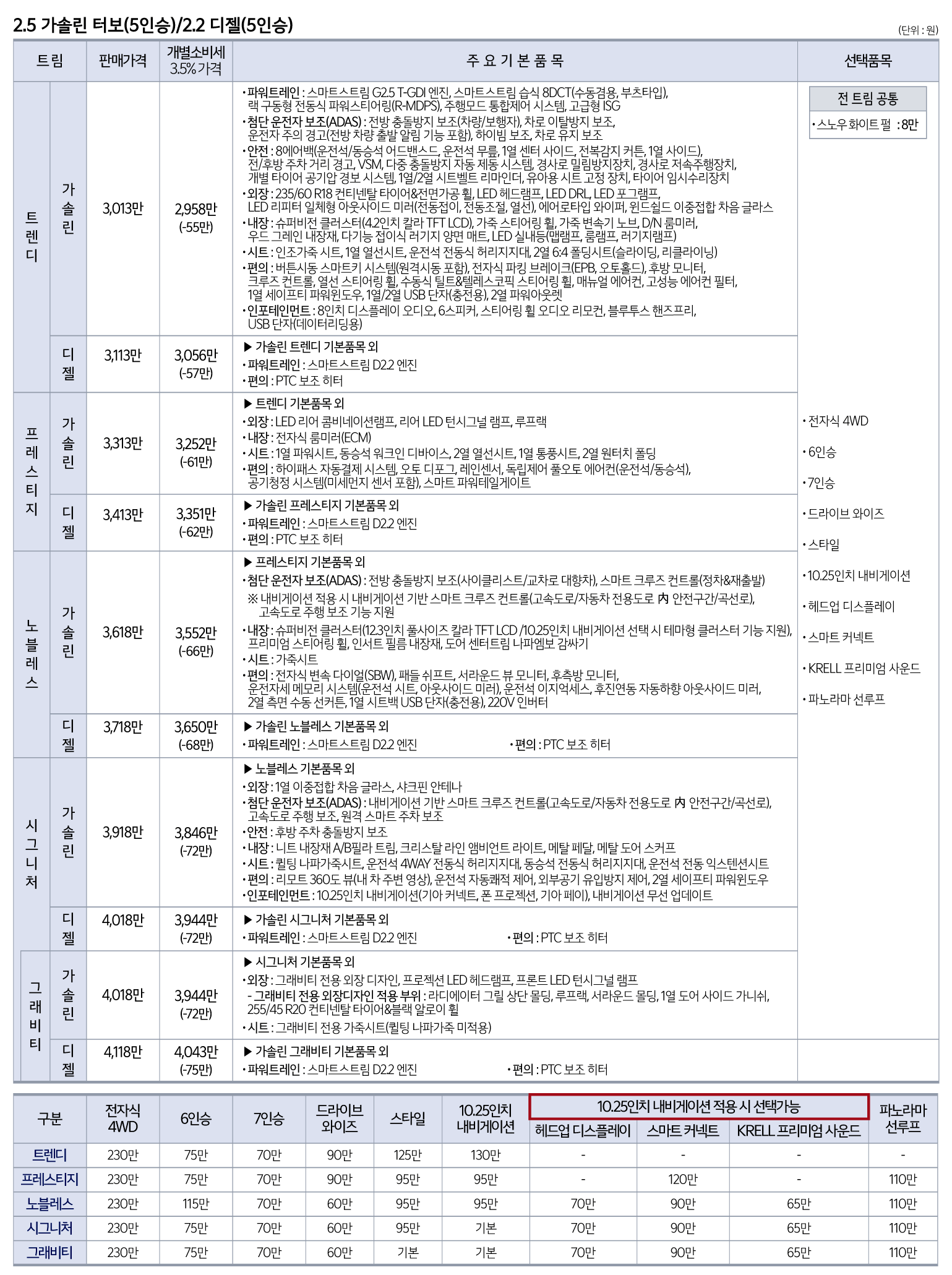 2022 쏘렌토 가솔린 가격은 트렌디 트림이 29,580,000원, 프레스티지 트림이 32,520,000원, 노블레스 트림이 35,520,000원, 시그니처 트림이 38,460,000원, 그래비티 트림이 39,440,000원입니다.