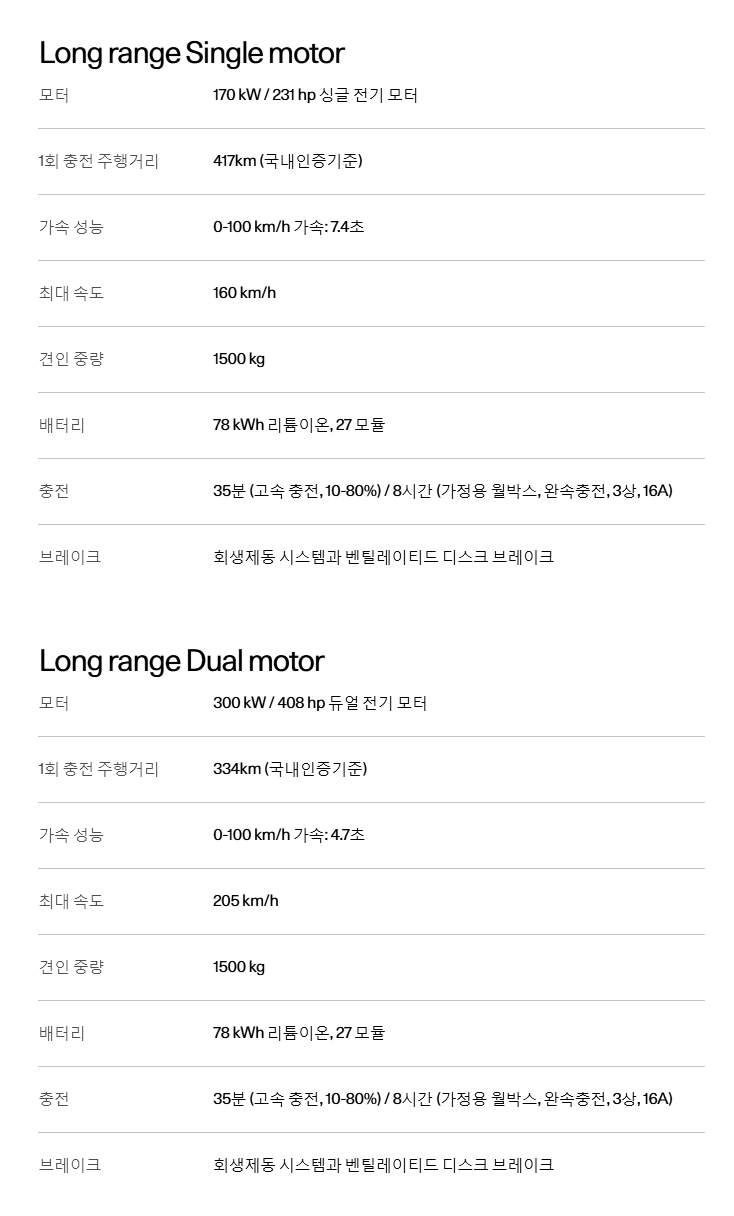 폴스타2 롱레인지 싱글모터 모델은 231마력(170㎾)과 330Nm의 토크 성능을 발휘하며 1회 충전 시 최대 주행거리는 417㎞입니다.