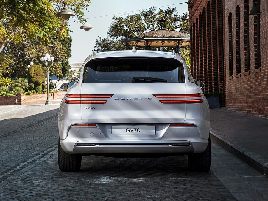 gv70 전기차 휠은 19인치 또는 20인치 전기차 전용 휠을 선택할 수 있습니다. gv70 후면은 수평의 넓고 간결한 범퍼와 심플한 스키드 플레이트를 적용해 모던한 이미지를 만들었습니다.