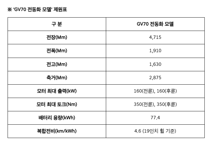 gv70 전기차 제원은 전장 4715mm, 전폭 1910mm, 전고 1630mm, 축거(휠베이스) 2875mm이며, 전륜과 후륜에 각각 최고출력 160kW, 최대토크 350Nm의 모터를 탑재해 합산 최고출력 320kW(부스트 모드 시 360kW), 최대토크 700Nm의 성능을 발휘합니다.