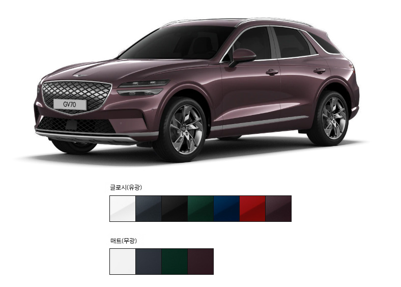 제네시스 gv70 전기차 외장 색상은 우유니 화이트, 카본 메탈, 비크 블랙, 카디프 그린, 로얄 블루, 마우나 레드, 바로사 버건디 등 7가지 유광 컬러와 마테호른 화이트, 멜버른 그레이, 브런즈윅 그린, 바로사 버건디 등의 무광 컬러까지 총 11종의 외장 컬러가 있습니다.