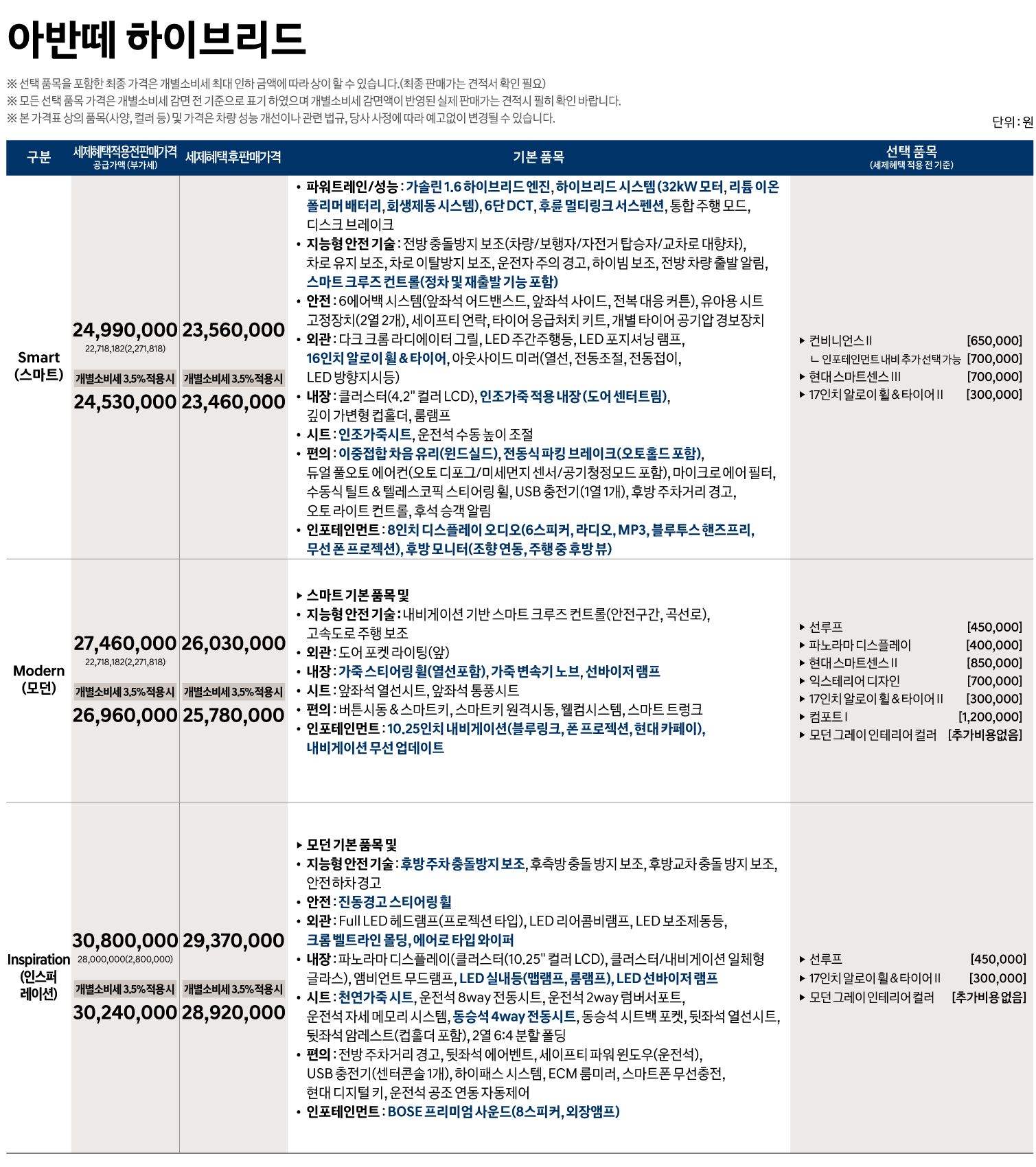 2022 아반떼 하이브리드 가격은 개별소비세 3.5% 기준으로 세제 혜택을 적용받은 가격이 스마트 트림은 23,460,000원이며, 모던 트림은 25,780,000원, 인스퍼레이션 트림은 28,920,000원입니다.