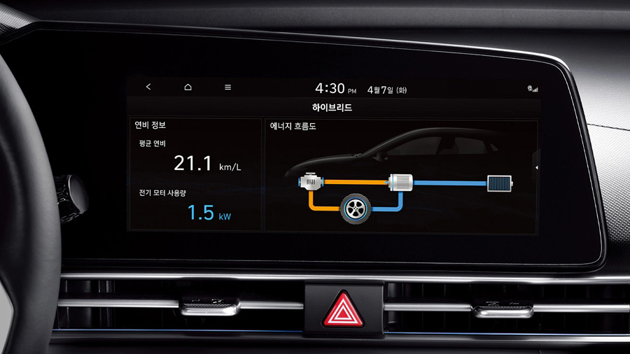 주행 정보와 연비 정보, 에너지 흐름도, ECO 드라이빙 등 다양한 전용 컨텐츠를 제공해 스마트한 경험과 운전의 즐거움을 제공합니다.