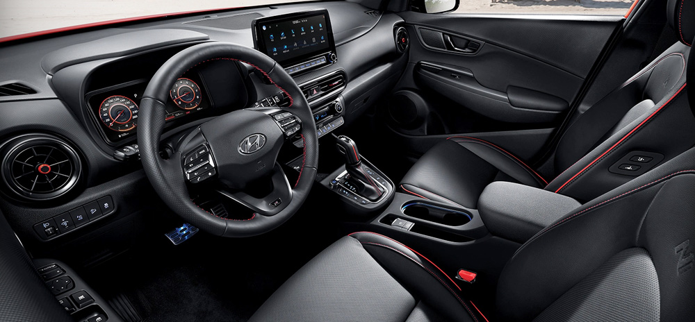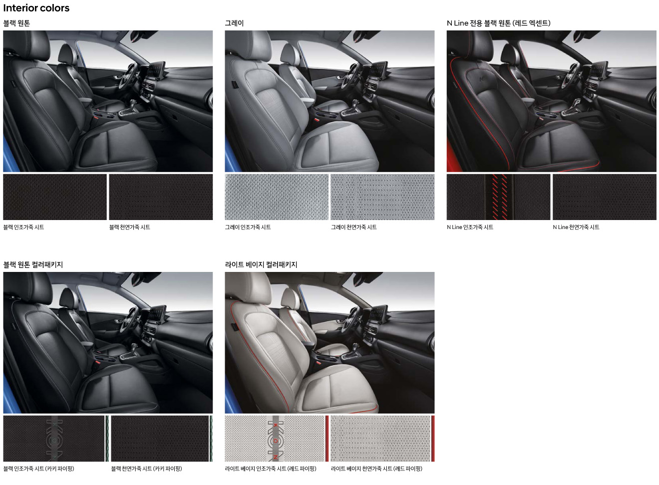 2022 코나 내장 색상은 블랙 원톤과 그레이가 있으며, 코나 N라인 실내에는 레드 엑센트가 들어간 N Line 전용 블랙 원톤 인테리어 컬러가 적용됩니다.