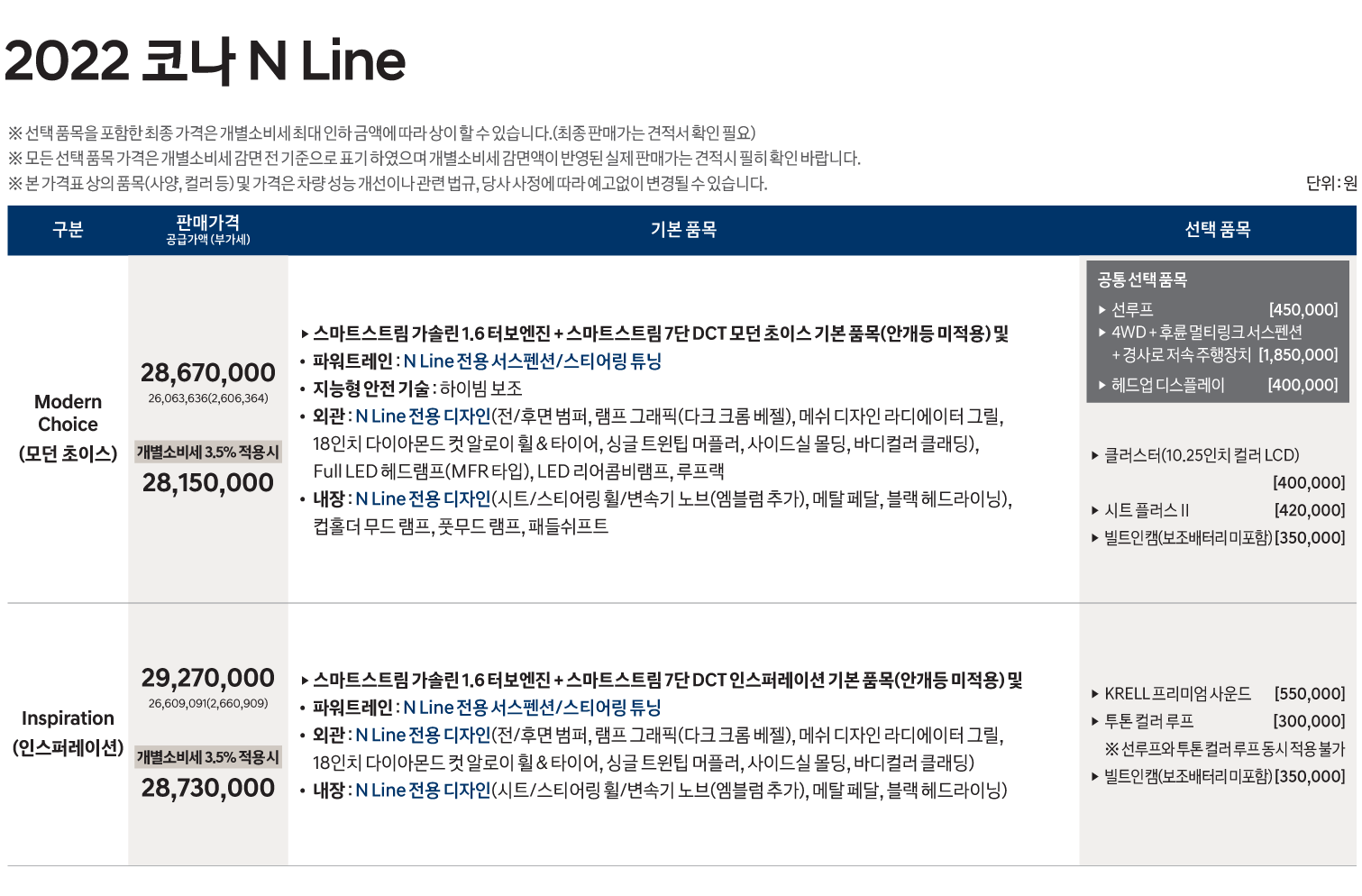 2022 코나 n라인 가격은 모던 초이스 트림이 28,150,000원이며, 인스퍼레이션 트림이 28,730,000원입니다. 여기에 4륜 구동 선택 시 185만원, 헤드업디스플레이 추가 시 40만원, 선루프 선택 시 45만원이 추가됩니다.