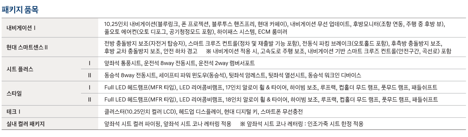 또한 10.25인치 내비게이션(블루링크, 폰 프로젝션, 블루투스 핸즈프리, 현대 카페이), 내비게이션 무선 업데이트, 후방 모니터(조향 연동, 주행 중 후방 뷰), 세이프티 파워 윈도우(운전석), 러기지 언더트레이 & 플로어 보드, 레인센서, 하이패스 시스템, ECM 룸미러, 풀오토 에어컨(오토 디포그, 공기청정모드 포함) 등도 기본으로 제공됩니다.